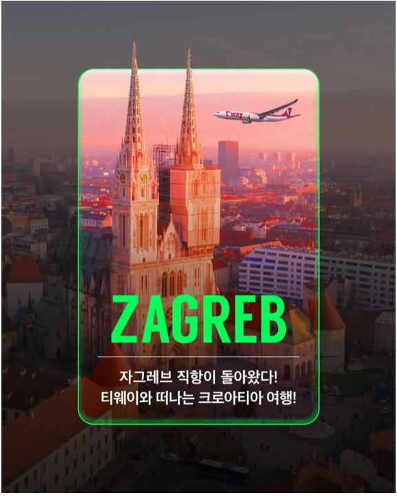 31일 크로아티아관광청에 따르면 티웨이항공은 7월 2일부터 10월 24일까지 인천-자그레브 노선을 주 3회(화·목·토요일) 운항한다. 비행시간은 약 11시간이며, 항공권은 항공사 홈페이지와 여행사를 통해 판매 중이다. 편도 운임은 50만 원대다 .