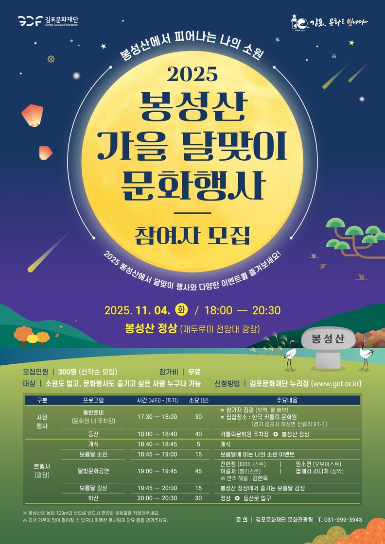 [뉴스트래블=정국환 기자] 김포문화재단은 오는 11월 4일 봉성산 재두루미 전망대에서 ‘2025 봉성산 가을 달맞이 문화행사’를 개최한다고 밝혔다.