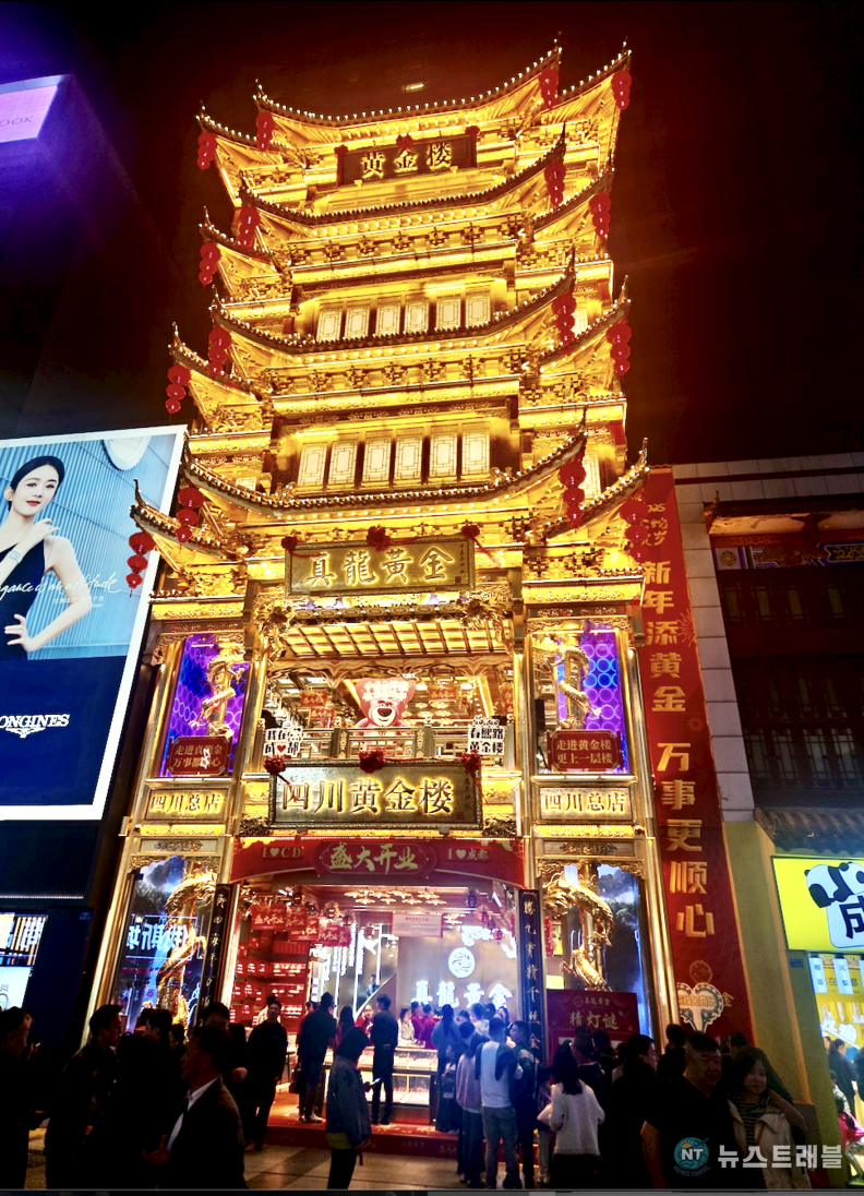 전통 누각 양식으로 꾸며진 '四川黄金楼(쓰촨 황금루)’는 금빛 장식과 붉은 등불로 거리의 랜드마크 역할을 한다. 귀금속을 판매하는 매장이지만, 화려한 외관만으로도 관광객들의 발길을 붙잡는다.