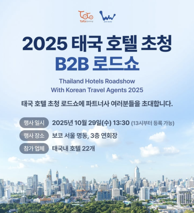 윈윈트래블과 토토부킹, 몽키트래블이 함께 주최하는 ‘2025 태국 호텔 초청 B2B 로드쇼’가 오는 29일 서울 명동 보코 서울 3층 연회장에서 개최된다.