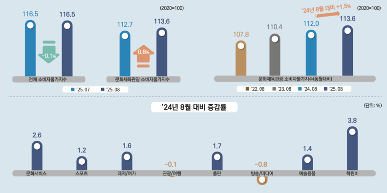 한국문화관광연구원이 발표한 「2025년 9월 문화체육관광 월간동향」에 따르면, 2025년 8월 기준 문화체육관광 소비자물가지수는 113.6(2020=100)으로 전월보다 0.8%, 전년 동월보다 1.5% 상승했다. 전체 소비자물가지수(116.5)가 전월 대비 0.1% 하락한 것과 달리, 문화체육관광 분야는 상승세를 이어갔다.