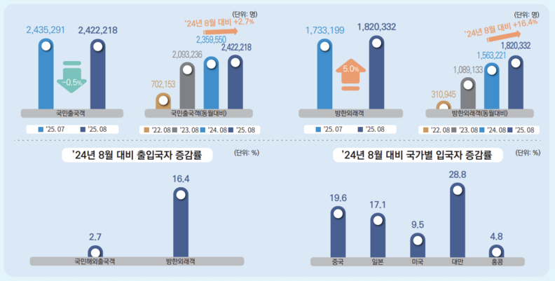 출국자(내국인 해외여행객)는 8월 한 달간 234만 명으로 전년 대비 9.2% 증가했다. 일본(72만 명, +15.8%)과 베트남(21만 명, +8.1%)으로의 여행이 두드러졌으며, 중국(15만 명)은 4% 감소했다. 1~8월 누적 출국자는 총 1,678만 명으로 지난해 같은 기간보다 11.3% 늘었다.