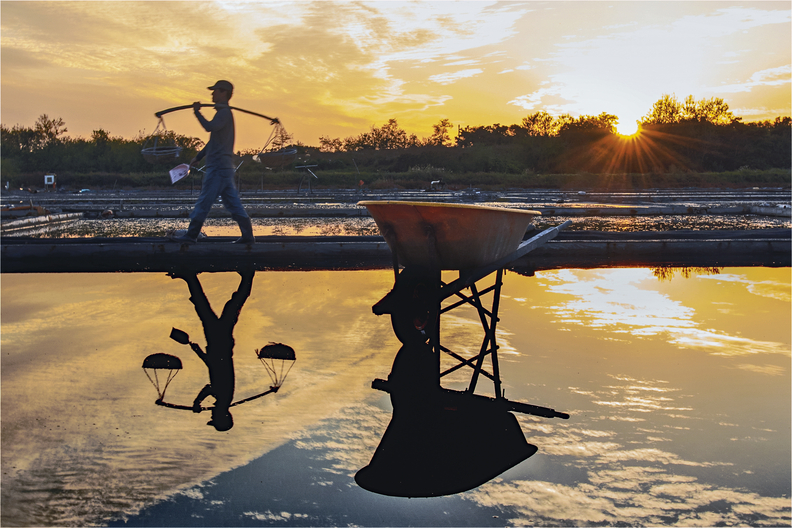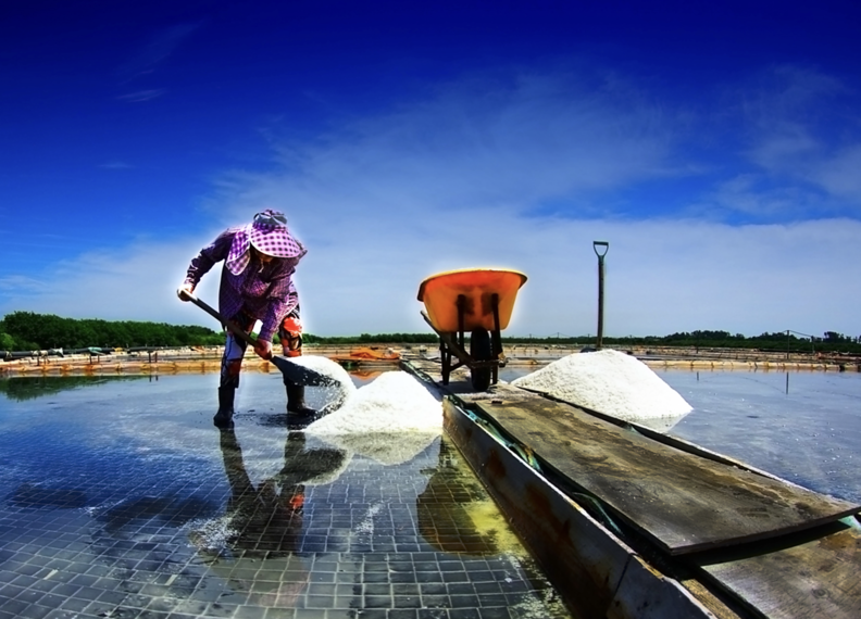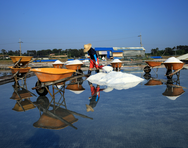 염전 체험을 위해서는 염판 위를 걸어야 하므로, 발이 더러워지는 것을 감수하고 방문하는 자세가 필요하다. 하얀 소금밭과 푸른 하늘이 만들어내는 대비는 인생 사진을 남기기에 최고의 배경이다.