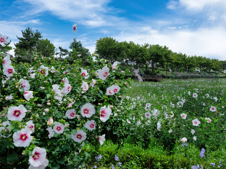 안산호수공원의 하이라이트는 단연 무궁화동산이다. 2007년 조성된 이 동산은 약 6만 6천㎡(약 2만 평) 면적에 200여 종의 희귀 품종과 1만여 그루의 무궁화 나무가 심겨 있는 전국 최대 규모를 자랑한다. 이곳은 단순한 정원이 아니라, 일제강점기에도 끊임없이 피고 지며 민족의 굳건한 정신을 상징했던 무궁화의 '불멸의 코드'를 보존하려는 집념의 결과물이다.