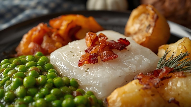이 음식이 진정 빛나는 순간은 ‘곁들임’과 만날 때다. 노르웨이에서는 루테피스크를 완성하기 위해 세 가지를 거의 필수적으로 준비한다. 첫째, 완두콩 스튜(pea stew). 고소하고 달큰한 풋콩의 풍미가 알칼리 처리된 생선의 은근한 맛을 잡아준다. 둘째, 바삭하게 구운 베이컨 조각과 녹인 버터. 기름기 없는 루테피스크에 풍미를 더하고 식감의 균형을 잡는다. 셋째, 감자. 삶은 감자 또는 노르웨이 특유의 속이 단단한 품종을 곁들여 식사를 완성한다. 이 조합은 오랜 세월을 통과하며 정교하게 다듬어진 조리 방식으로, 루테피스크의 부드러움과 베이컨의 고소함, 완두콩의 단맛이 절묘하게 얽혀 겨울 한 끼를 풍성하게 만들어준다.