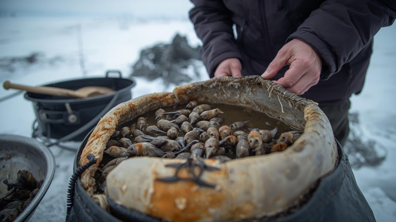 깃털, 내장 그대로. 그리고 가죽을 다시 꿰매 바다표범의 기름으로 봉한 뒤, 빙설 아래 파묻어 수개월에서 길게는 반년 이상을 발효시킨다. 비교적 따뜻한 여름에도 곰이나 개가 파헤치지 않도록 큰 돌을 눌러 덮는다. 이를 꺼내는 시점은 겨울. 조상들이 북극에서 살아남기 위한 마지막 비축 식량. 그러니 냄새와 비주얼에 놀라기 전에 먼저 떠올려야 할 것은 생존의 역사다.