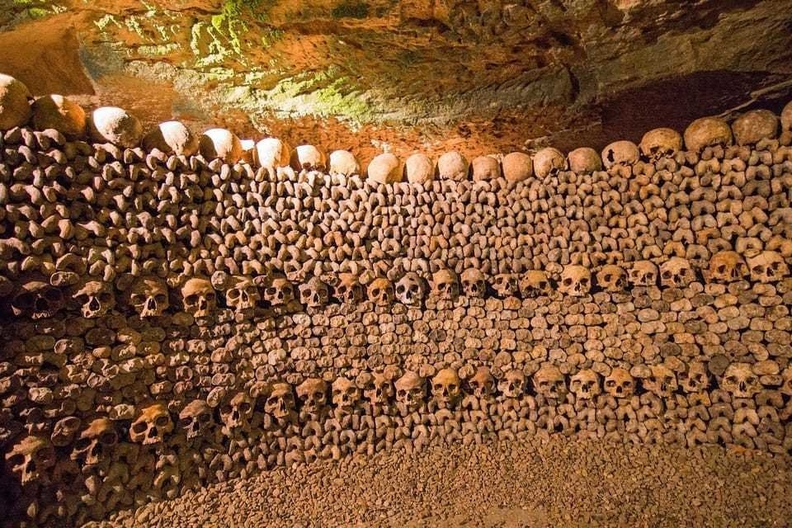좁은 통로를 따라 걷다 보면 통로의 경계가 갑자기 바뀐다. 석벽을 대신해 사라지는 것은 수백만 구의 인간 뼈다. 정교하게 쌓인 대퇴골과 두개골이 마치 벽돌처럼 겹겹이 쌓여 이어지는데, 이 배열은 장식이 아니라 공간을 정리하기 위한 ‘구조물’에 가깝다. 조명은 노란빛으로 낮게 깔리고, 그 사이에서 인간의 형체는 사라지고 모양만 남은 뼈들이 차갑게 빛을 받는다.