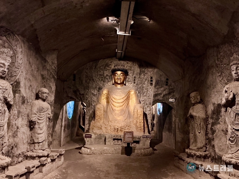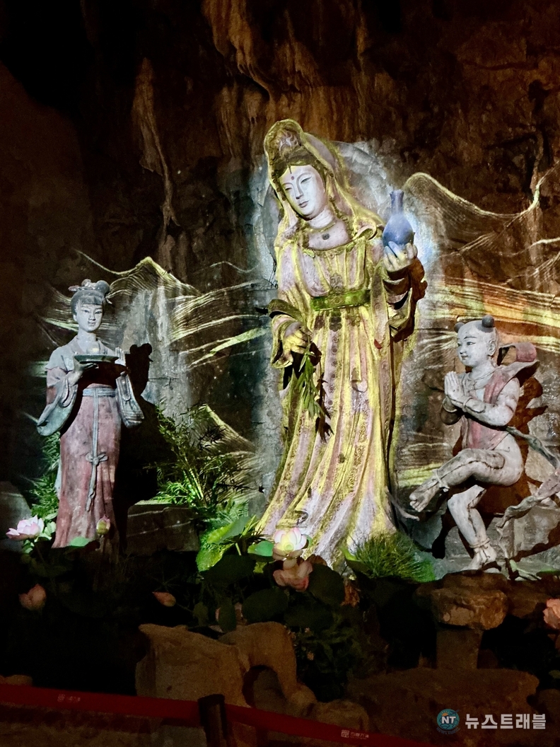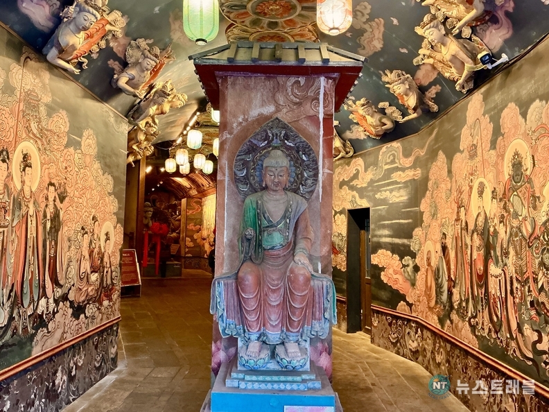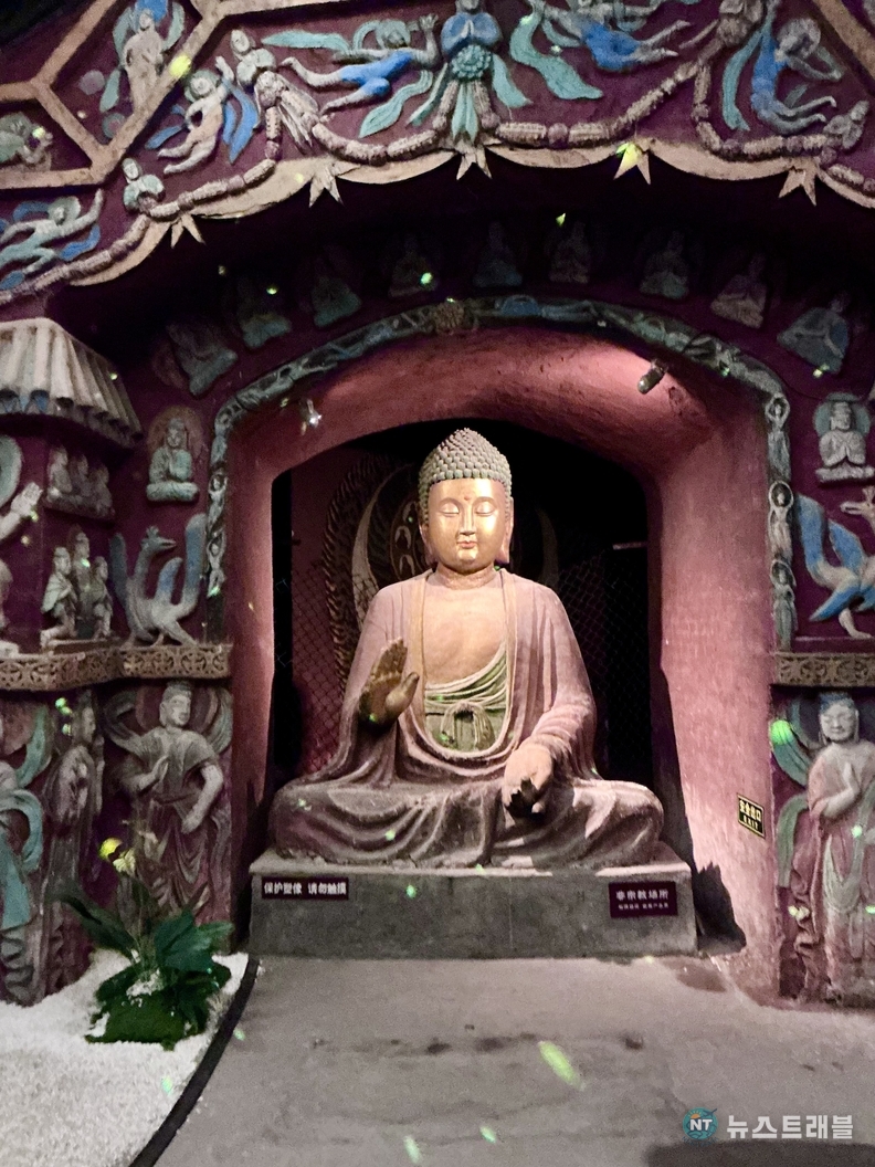 사굴만상은 이름 그대로 여러 개의 석굴과 수많은 불상을 한 공간에 집약한 불교 조형군이다. 바위를 파 만든 회랑을 따라 이동하다 보면, 관람객은 자연스럽게 어둠 속으로 들어가게 된다. 외부의 소음과 빛이 차단된 내부에서 가장 먼저 시선을 끄는 것은 규모보다 ‘밀도’다. 암벽을 가득 메운 좌불 군상과 벽면을 채운 벽화는 하나의 장면이라기보다, 불교 세계관 전체를 압축해 보여주는 듯한 인상을 준다.