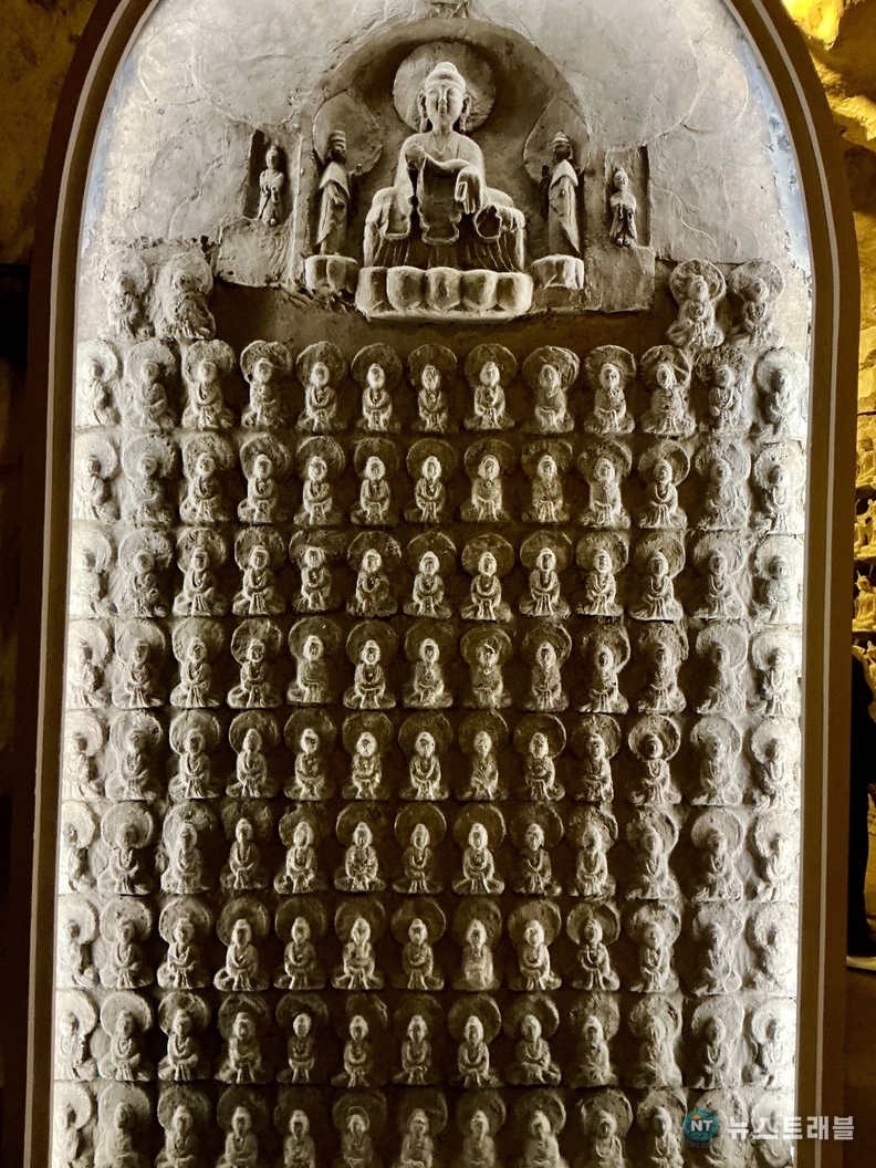 석굴 내부의 대표적인 장면은 만불 군상이다. 동일한 자세의 작은 불상들이 반복적으로 배치돼 있는데, 개별 조각은 단순하지만 그 수가 만들어내는 장면은 압도적이다. 불교에서 말하는 무량함과 영원, 윤회의 개념이 시각적으로 구현된 공간이라 할 만하다. 조형의 힘은 크기에서 나오기보다, 반복과 축적에서 나온다는 점을 이곳은 분명하게 보여준다.