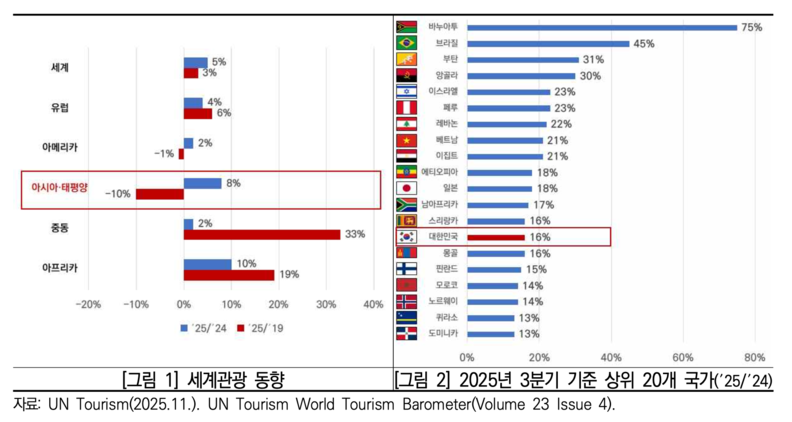 반면 일본과 중국 등 동아시아 주요국은 관광객 수가 꾸준히 증가하고 있음에도 불구하고, 아직 2019년 수준에는 미치지 못한 것으로 나타났다. 보고서는 국제선 공급 회복 속도, 비자·출입국 환경 변화, 지정학적 요인 등이 관광 회복에 영향을 미치며 국가 간 격차를 확대하고 있다고 분석했다.