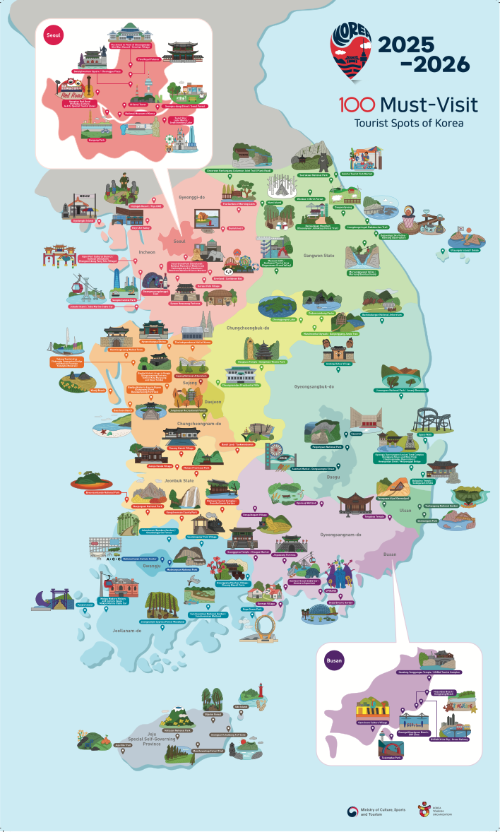 [뉴스트래블=편집국] 서울 광화문에서 시작해 제주도의 해안까지, 한국의 여행지는 각기 다른 이야기를 품고 있다. 2025‑2026 한국관광 100선은 역사적 유산과 자연의 비경, 전통과 현대 문화가 조화를 이루는 공간을 선별해 소개한다. 수도권의 궁궐과 박물관, 강원권의 산과 강, 충청권의 호수와 숲, 전라권의 예술과 자연, 경상권의 천년 문화와 도시 야경, 제주권의 이국적 섬 풍광까지, 이 100곳은 단순한 관광지가 아니라 한국의 문화와 자연을 온전히 경험할 수 있는 장이다.