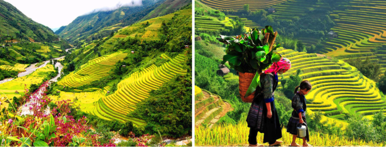 사파의 지형은 한 폭의 동양화처럼 이어진 계단식 논의 물결로 대표된다. 거대한 고산 계곡을 따라 형성된 무엉호아 계단식 논은 봄부터 가을까지 계절에 따라 색을 달리한다. 녹음이 가득한 초록빛, 황금빛 수확의 계절, 그리고 물이 고인 반사면이 만들어내는 풍경은 자연이 인간과 함께 빚어낸 작품과 같다. 트레킹 코스는 깟깟(Cat Cat), 라오짜이(Lao Chai), 타반(Ta Van) 등의 마을로 이어지며, 각 포인트에서 다른 장면을 보여 준다.