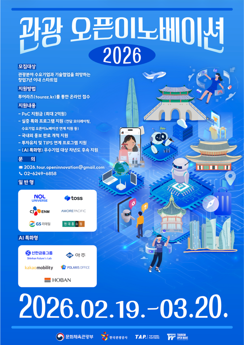 [뉴스트래블=박주성 기자] 문화체육관광부와 한국관광공사가 ‘2026 관광 오픈이노베이션 사업’ 참여 스타트업을 오는 3월 20일까지 모집한다.