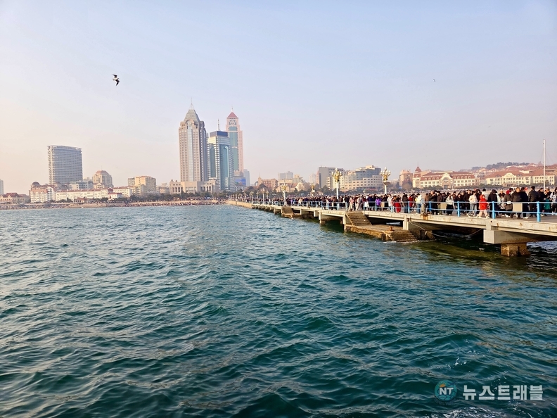 사진 속에서도 하늘을 가르는 갈매기 떼와 끝없이 이어진 인파가 대비를 이룬다. 바다를 가로지르는 긴 다리 위로는 발 디딜 틈 없이 사람들이 이어지고, 멀리 도심의 고층 빌딩과 유럽풍 건물들이 칭다오 특유의 이국적 분위기를 완성한다. 전통과 근대, 자연과 도시가 한 프레임 안에서 공존하는 순간이다.