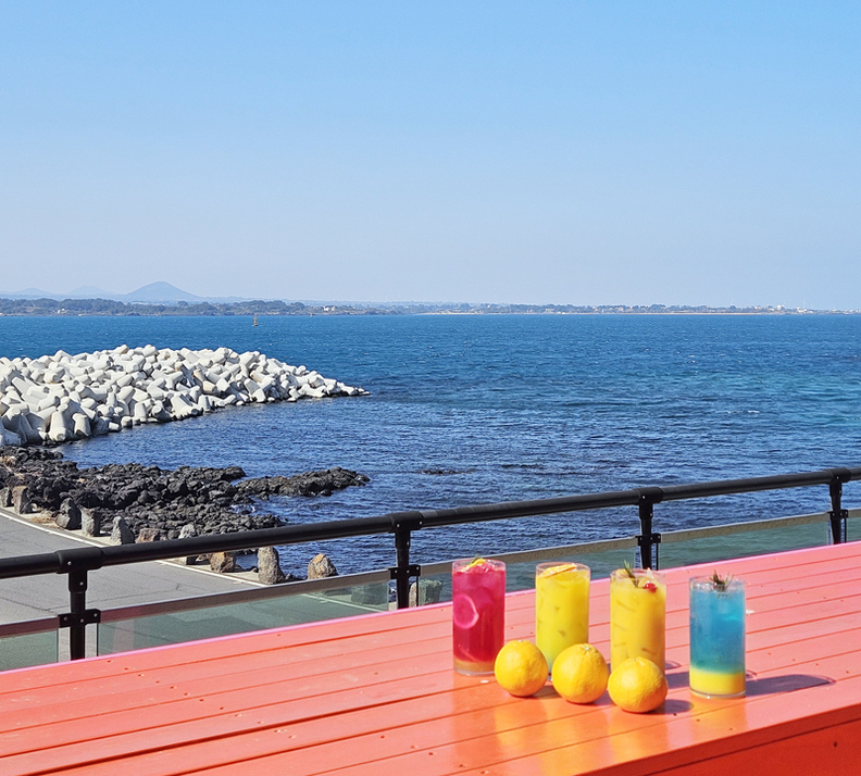 카페 ‘우도랑’의 시그니처 음료로 추천받는 것은 한라봉과 레몬의 조화 ‘한라봉 오션’과 우도 바다의 모습을 그대로 담은 상큼한 파인애플과 블루 레몬의 조화 ‘우도오션’도 좋지만 ‘우도 선셋’은 우도 석양을 표현해 낸 음료로 제주 천혜향과 오미자맛의 조화로운 음료이다.