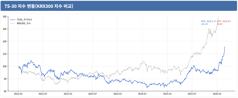 지표를 구체적으로 살펴보면, 2월 말 기준 TS-30 지수는 131.26을 기록하며 전월 말 105.60 대비 무려 24.3%나 급등했다. 이는 지난 2024년 8월 기록했던 최저점인 64.84와 비교했을 때 2배 이상 성장한 수치로, 관광업계가 장기적인 침체를 완전히 벗어나 본격적인 성장 궤도에 진입했음을 시사한다. 특히 일반적인 시장 지표인 KRX300 지수와 비교해도 관광산업의 수익률이 압도적인 우위를 점하고 있다는 점이 고무적이다.